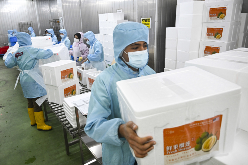 10月16日,在马来西亚雪兰莪州的一家榴莲加工厂,工作人员将封装好的榴莲搬运至恒温冷链车,准备运往吉隆坡国际机场,销往中国市场。新华社 发